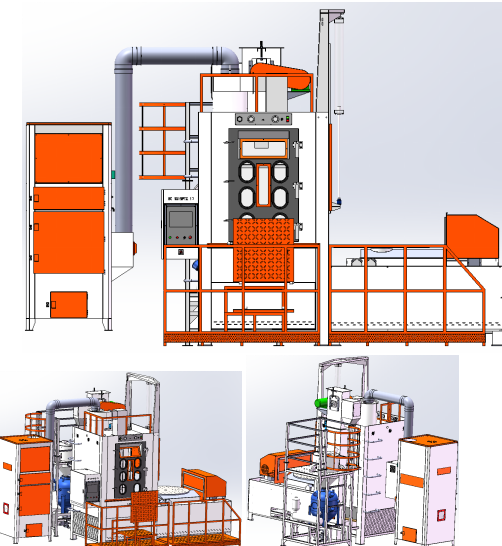 5、大轉(zhuǎn)盤帶動(dòng)工件轉(zhuǎn)動(dòng),模組化噴槍(通過(guò)配方編程輸入的數(shù)據(jù))按所需方位對(duì)工件進(jìn)行自動(dòng)噴砂;